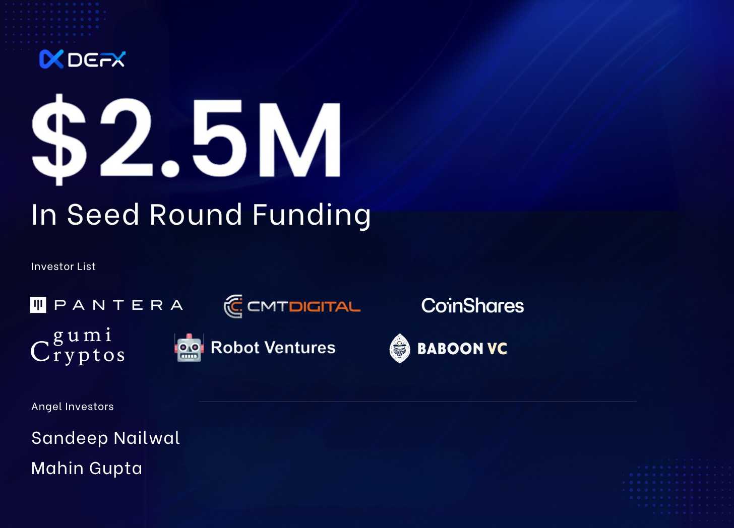 The round includes participation from Pantera Capital, CMT Digital, Gumi Cryptos, CoinShares, Robot Ventures, Cadenza Ventures, Baboon VC, and angel investors Sandeep Nailwal (Polygon) and Mahin Gupta (Liminal).